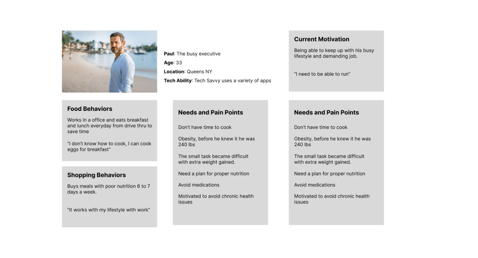 Paul is used to running his busy lifestyle with fast food to go. For the past year, he has been enjoying the ease of the drive-thru at his job to save time. He saw some weight gain and difficulty doing simple tasks due to the weight gain. but after going to the doctor He was shocked to hear he needs to start taking medication for gout, and high blood pressure and be aware he has borderline diabetes. All are related to poor nutrition. He wanted an alternative to medication and needs help but didn't know where to go, he knows how to cook eggs but he doesn't have time to cook or shop. clean dishes. He needs to run. He notice his neighbor who lost about 30 lbs and after a quick chat the neighbor told him about the Healthy Habits meal plan
