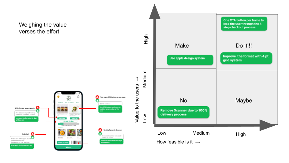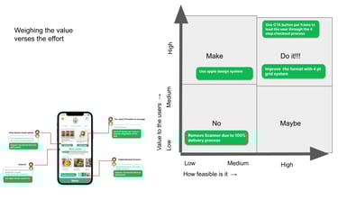 Having a list of problems and ideas on how to solve them is a good thing, I use this process to understand what are the low-hanging fruit. For each opportunity, we need to understand what it will take to deliver it and how much value we will add for the end user. Ideally, we want to focus on the upper right quadrant in the graph below.