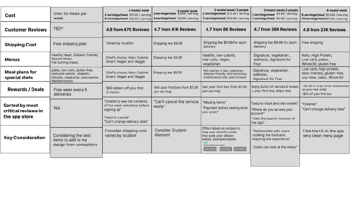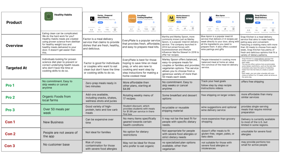 Understanding what each competitor's product is aiming for, and comparing those apps to mine will give a high-level overview of where you stand.