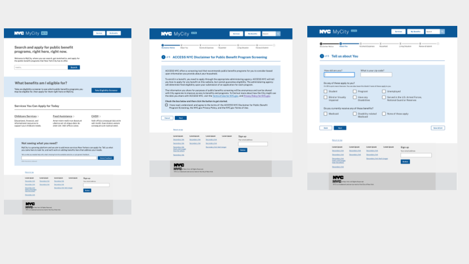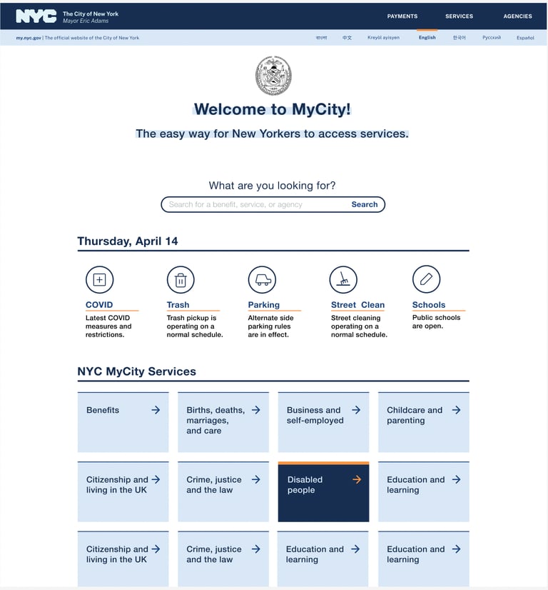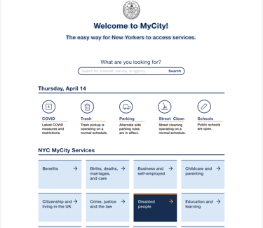 The MyCity platform will be a public-facing internet portal designed to serve as a seamless and intuitive experience for interacting with all of the City government. MyCity will be a unified intake tool that enables New Yorkers to find and apply for City services, as well as check the status of City services they have applied for, all without ever having to learn the City’s complex org chart of agencies and officials.